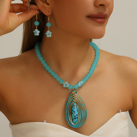 ชุดเครื่องประดับใหม่แฟชั่นยุโรปและอเมริกาจี้อัญมณีหยดน้ำสีฟ้าและต่างหูชุดฝรั่งเศส