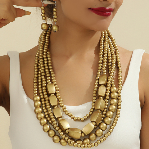 ชุดเครื่องประดับทำด้วยมือแนวโบฮีเมียนแบบชาวเผ่าสร้อยคอลูกปัดทำจากไม้5ชั้นต่างหูห้อยต่างหูแบบห้อยสไตล์ตะวันออกกลางสำหรับงานเลี้ยง